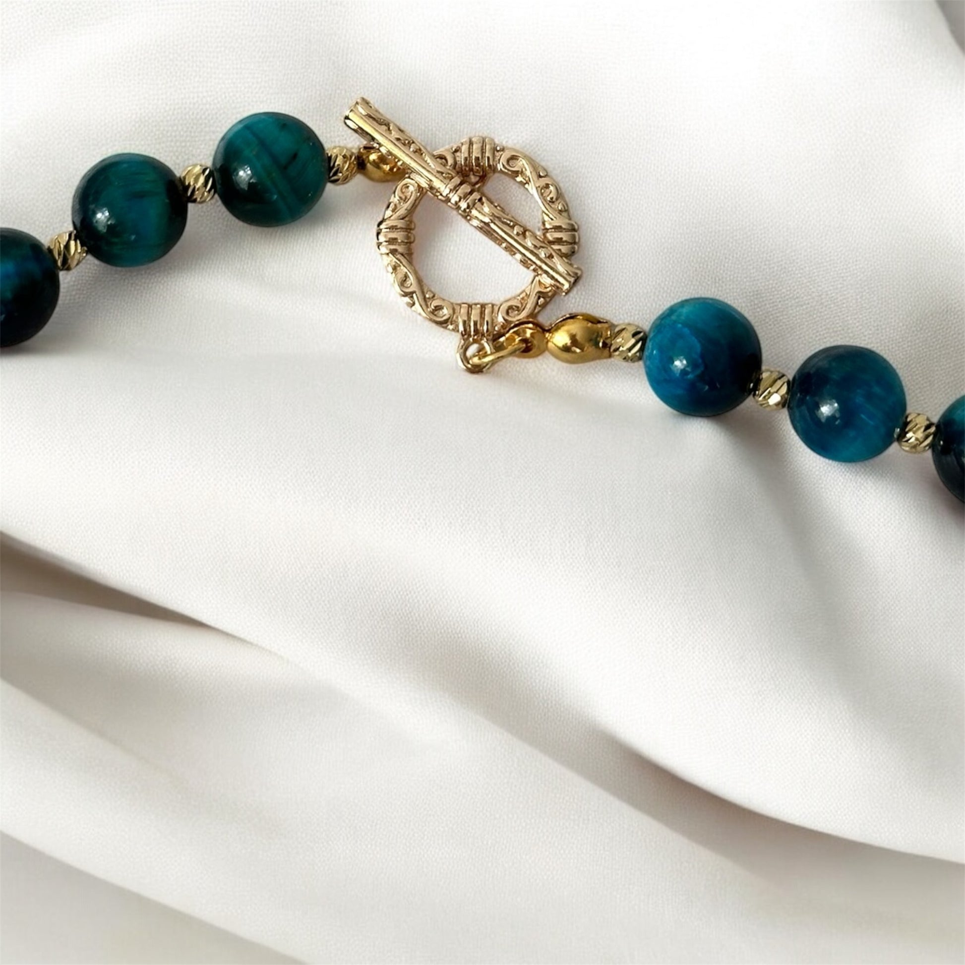Dive into the mystique of the ocean with this elegant 42 cm necklace, crafted from 8 mm natural Blue Tiger’s Eye gemstones. Known for their deep, shifting hues and protective energy, these stones bring both beauty and meaning to your look. All components are 18K gold-plated, adding a warm glow that perfectly complements the cool, ocean-inspired tones. The centerpiece features a shimmering abalone shell set in gold, capturing the iridescence of the sea. Finished with a stylish OT (toggle) clasp for ease and elegance.