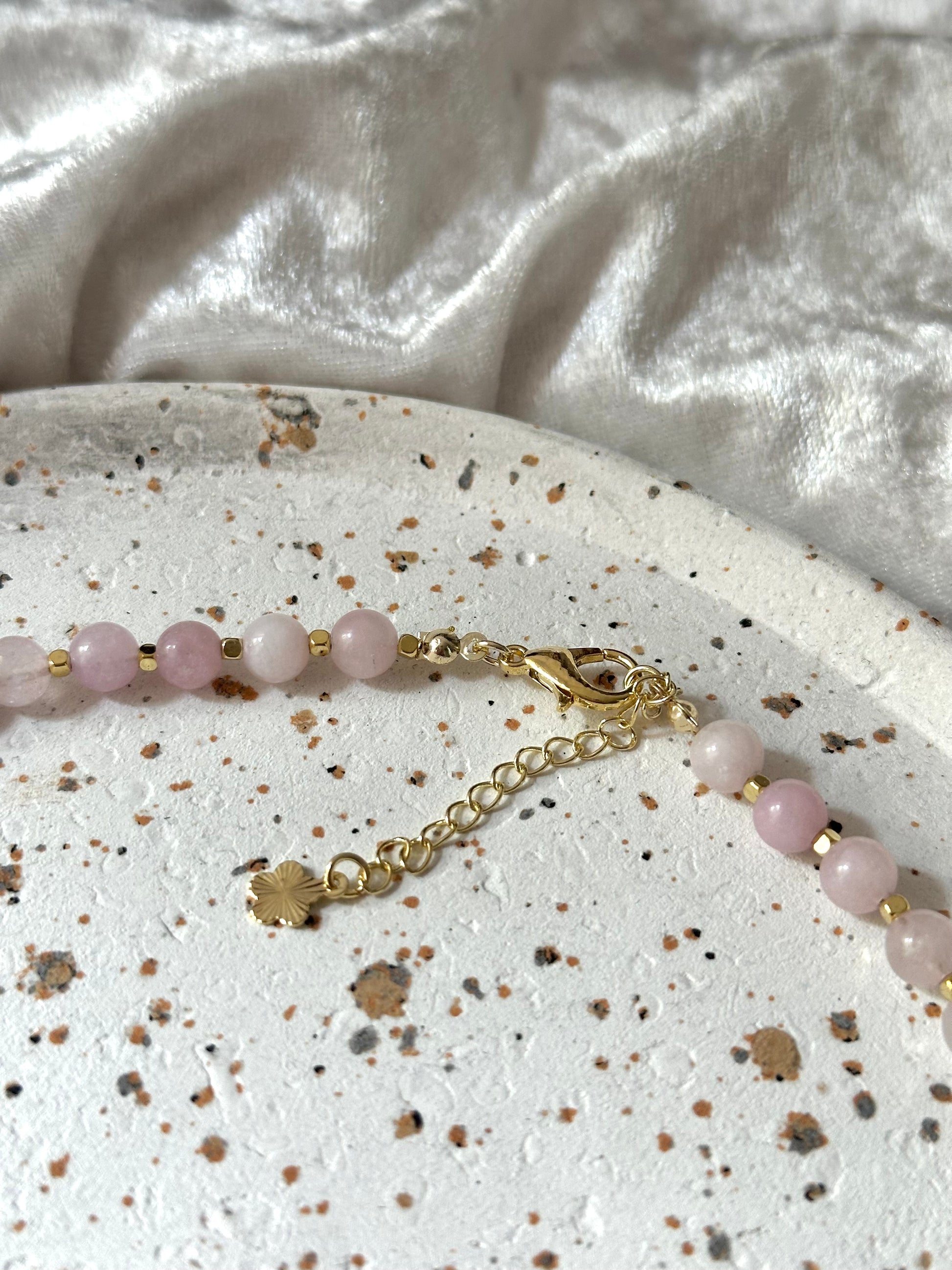 Crafted with love and intention, this delicate necklace features the gentle beauty of natural 6 mm Rose Quartz beads, the stone of unconditional love, compassion, and emotional healing. At its center shines a sparkling zircon heart pendant, symbolizing pure affection and connection. The pendant is plated with 18K gold, while the spacer beads are finished with 14K gold plating for a timeless, elegant touch. Rose Quartz is known to open and balance the heart chakra, inviting self-love and harmony into your life. With its soft pink hues and romantic design, this piece is perfect for everyday wear or as a meaningful gift for someone special.