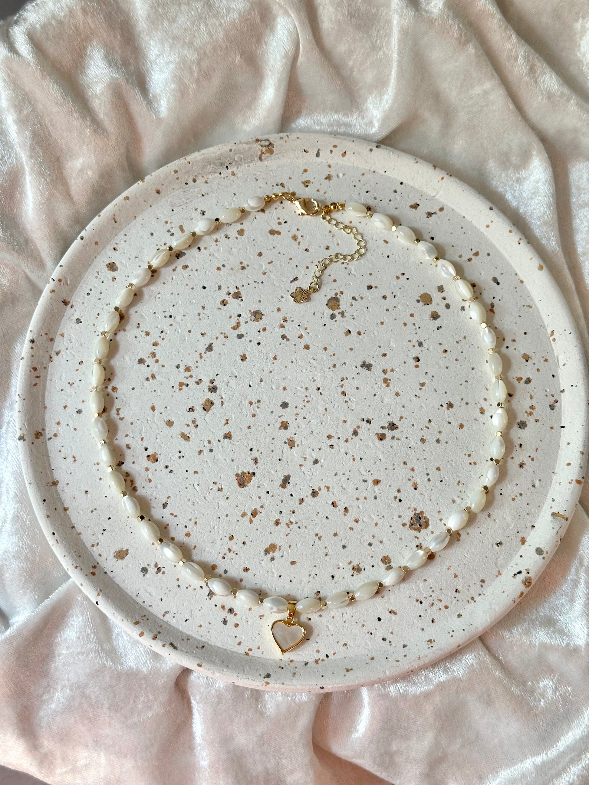 At its center, a heart-shaped mother of pearl pendant symbolizes love and purity, framed in luxurious 18K gold plating. The design is completed with delicate 14K gold-plated spacer beads for a timeless, refined look.